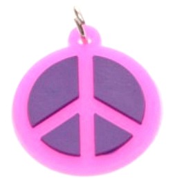 Detail-Beschreibung: Charms Motiv Peace mit Metallöse, Farben lila und violett, 1,5 mm dick und 2 cm, rund, Material: Gummi; z. B. für Bettelarmbänder, Taschenanhänger Trendy bags, Loombänder Loom bands, Scoubidoubänder und allen anderen Flechtbändern bestens geeignet.