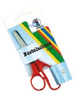 Die Schere ist vorne rund, ist ca. 13,5 cm lang und hat eine Metallschneide.