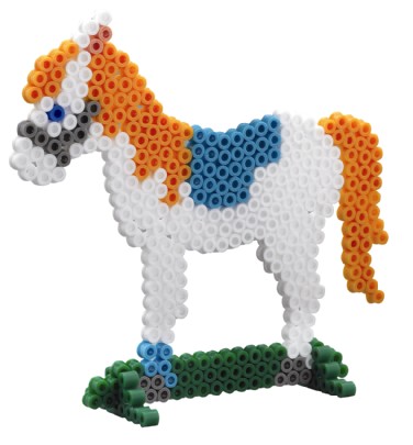 Inhalt dieser Bügelperlen Packung aus der Hamaperlen Midi-Serie: ca. 4000 Perlen, 2 Stiftplatten: Pferd und Haus, 14 Motivstützen, Motiv Vorlage, Anleitung und Backpapier.