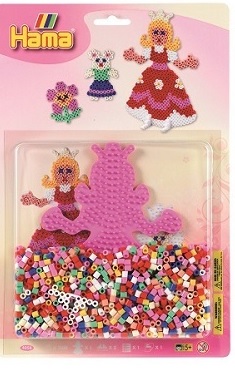 Inhalt: 1.100 Hama Bügelperlen midi, 1 Stiftplatte Prinzessin und 2 Motivstützen, Anleitung und Backpapier in einer geblisterten Aufmachung.