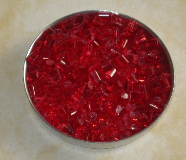 Schmelzgranulat "Colouraplast", gleiche Beschaffenheit und Produktionsnorm wie "Schmelzolan", das Material besteht aus kleinen transparenten Polystyrolperlen.