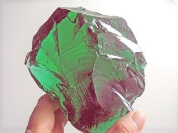 Glassteine z.B. für Gartendekorationen, Glasbrocken, transparent in grün, 1.000-gr Beutel, Durchmesser variabel zwischen 4 und 8 cm, mit ca. 6-7 Steinen - je nach Größe der sortierten Steine unterschiedlich, verschieden geformte Stücke aus grobem Glasbruch.