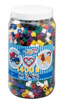 ca. 1400 Bügelperlen in einer praktischen Dose mit folgenden gemischten Farben: weiss, gelb, rot, lila, hellblau, grün, schwarz.