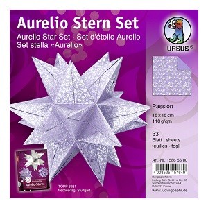 Der Aurelio Weihnachts-Stern gehört zu den schönsten und beliebtesten Basteltechniken mit Papier in der Weihnachtszeit. Benötigt werden dazu 30 gleich große, quadratische Faltblätter. Diese werden alle identisch gefaltet und schließlich zu einem Stern zusammengesetzt.