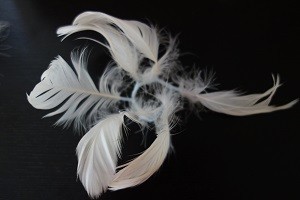 Weisse Gänsefedern mit Kranz in blau, ca. 3 cm Durchmesser.