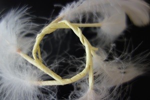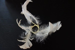 Weisse Gänsefedern mit Kranz in gelb, ca. 3 cm Durchmesser.