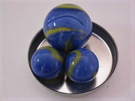 Produkt: Glasmurmeln im Netz, Serie Roboter, Valecnik, opak marmoriert blau-gelb, 16/25 mm, 21 Stck., 16 und 25 mm Durchmesser