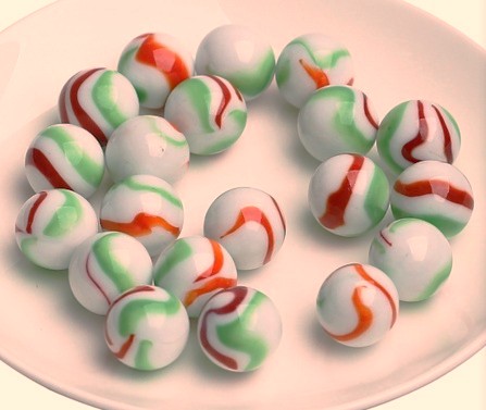 Glaskugeln blickdicht mit bunter Musterung, ca. 18 Stck., bestens geeignet für Dekorationen aller Art, als Spielmurmeln und vieles mehr.