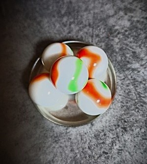 Glasmurmeln Spezialmusterung opak, mexikanischer Look, marmoriert, orangerot und grün gemustert, ca. 16 mm Durchmesser, 100 gr- Netz