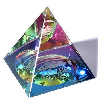 Verspiegelte, geschliffene Glaspyramide, im Geschenkkarton, aus echtem Kristallglas (Hochbleikristall 30 v.H), nahezu optisch rein.