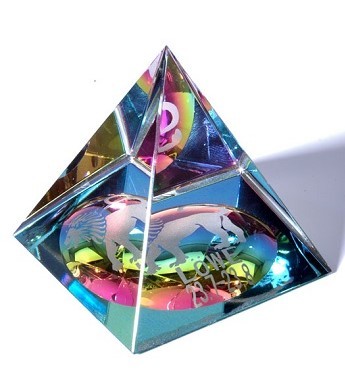 Die Glaspyramide hat eine Kantenlänge von 5 cm und ist ca. 6,5 cm hoch. Auf dem Boden befindet sich eine Filzverklebung für Möbelschutz. Auf dem Boden der Pyramide ist auch das Sternzeichen, das Wort sowie das Datum eingelasert worden. Das Glas ist in der aufwendigen Färbung Peacock verspiegelt, je nach Lichteinfall changieren die Farben.