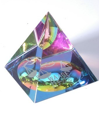 Verspiegelte, geschliffene Glaspyramide, im Geschenkkarton, aus echtem Kristallglas (Hochbleikristall 30 v.H), nahezu optisch rein.