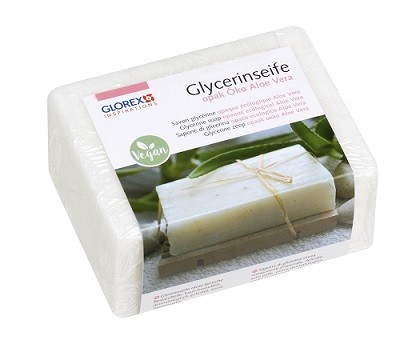 Gießseife öko ohne tierische Bestandteile und mit hautpflegendem Aloe Vera-Zusatz, dermatologisch getestet mit hautschonendem PH Wert 8,5 - 9. für Seifenherstellung vorwiegend bestehend aus natürlichen Glycerin bzw. pflanzlichen Rohstoffen.