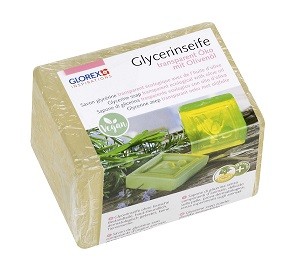 Gießseife öko ohne tierische Bestandteile und mit wertvollem Olivenöl-Zusatz, dermatologisch getestet mit hautschonendem PH Wert 9 für Seifenherstellung vorwiegend bestehend aus natürlichen Glycerin bzw. pflanzlichen Rohstoffen.