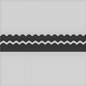 Die Schere hat einen Griff aus Kunststoff, eine Metallschneide und schneidet ein Schnittmuster im Wellen-Look in das Papier.