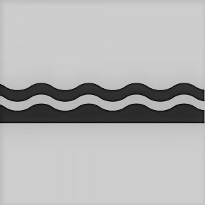 Die Schere hat einen Griff aus Kunststoff, eine Metallschneide und schneidet ein Wogenschnittmuster in das Papier.
