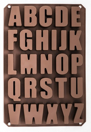 Silikongießform A bis Z, 26-fach, Tiefe ca. 25 mm, Länge meist ca. 50 mm, Breite meist zwischen 30-45 mm pro Buchstabe.