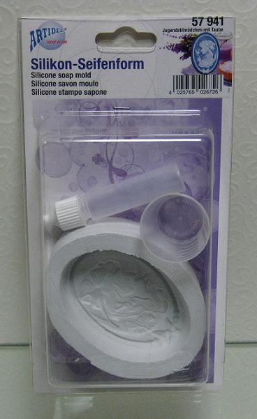 Die SB-Packung enthält eine Siliconform, eine kleine Penflasche 30 ml mit Auslaufdüse, einen Mischbecher und eine ausführliche Verarbeitungsanleitung für das Herstellen einer zweifarbigen Camée-Seife.