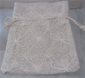 Produkt: Edles Stoffsäckchen klein in bedruckter Textilstickerei, Vorderseite mit Organzaähnlichem Stoff- und Rückseite mit Leinenstruktur, 10x14 cm, creme-natur, Stück.